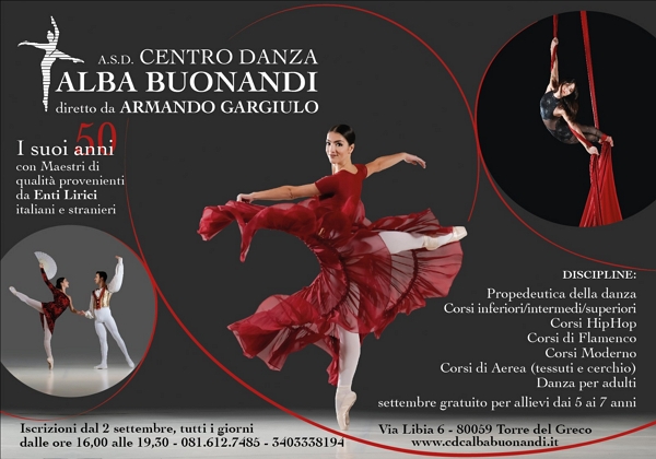 | A.S.D. Centro Danza a Torre del Greco dal 1975 A.S.D. è un centro internazionale di danza, fondato e diretto da Alba Buonandi. I corsi sono riconosciuti dalla Regione Campania, dal Ministero della Cultura e dall'Unione Europea | ||||||||||||